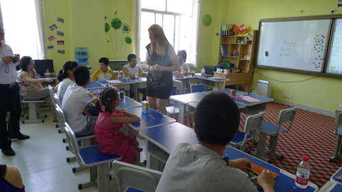 不一會兒,鈴聲響了,學生們走進教室、挑選好座位圍成半圓,家長則被工作人員安排在教室后側的觀摩區內。 “中加教育”委派的資深教育專家Feriel Parker女士, 開始與蘭州的學生和家長們零距離見面。由她先后主講的英語和法語兩堂特色課,無需翻譯輔助,通過淺顯生動的交流互動,孩子們對陌生的語言環境逐漸“打開心靈”、“張開嘴巴”,并慢慢融入其中。