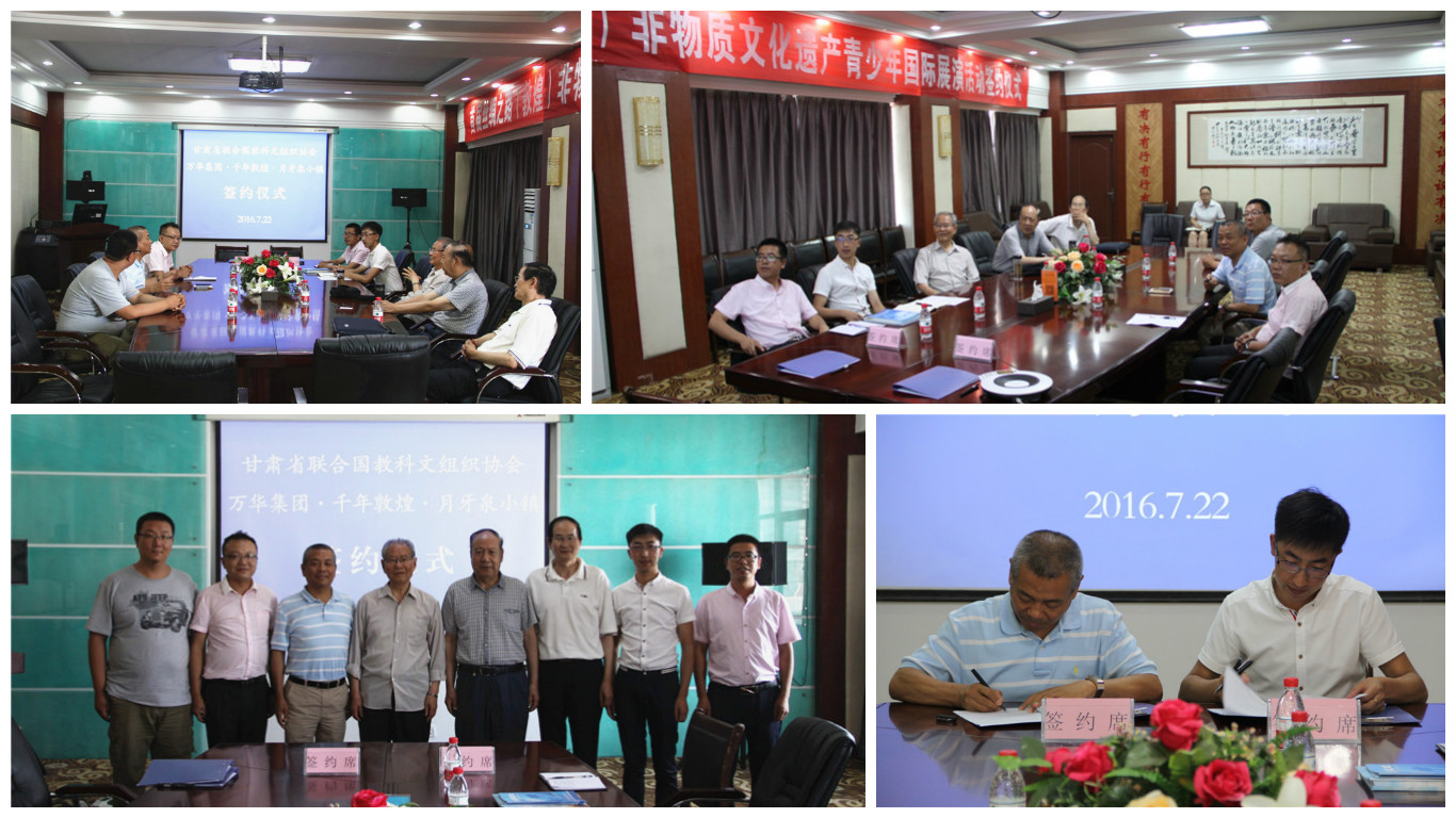 7月22日下午3時30分,甘肅省聯合國教科文組織協會杜永軍會長與甘肅萬華實業集團總經理、敦煌千年古城開發有限公司董事長牛新偉,在萬華集團三樓會議室就“首屆絲綢之路(敦煌)非物質文化遺產青少年國際展演活動”合作事宜正式簽約。甘肅省人民政府原副秘書長、協會總顧問于忠正,甘肅省教育廳原副廳長、協會終身榮譽會長馬培芳等領導出席并見證了簽約儀式。
