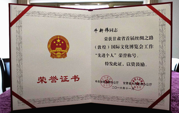 近日,首屆絲綢之路(敦煌)國際文化博覽會總結表彰大會在敦煌大劇院召開。會議表彰了首屆文博會工作中敦煌市涌現出來的50個先進集體、160名先進個人,以及1300多名群防群治工作先進個人。敦煌千年古城開發有限公司董事長牛新偉榮獲“先進個人”榮譽稱號。