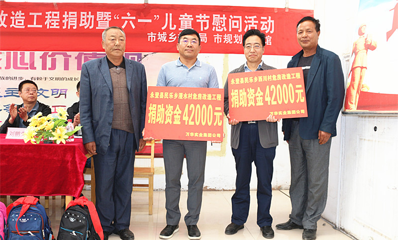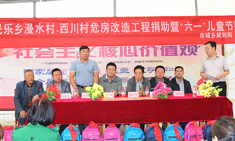 6月1日上午11時20分,民樂鄉(xiāng)漫水村、西川村危房改造工程捐助暨六一兒童節(jié)活動在永登縣民樂鄉(xiāng)漫水村村委會如期舉行。甘肅萬華實業(yè)集團有限公司向漫水村、西川村各捐助4.2萬元危房改造補助資金,蘭州市城鄉(xiāng)規(guī)劃局領(lǐng)導(dǎo)將嶄新的書包和學(xué)生用品送到當?shù)睾⒆觽兪种小Lm州市城鄉(xiāng)規(guī)劃局局長陳一夫、黨組書記楊正岱,蘭州市城鄉(xiāng)規(guī)劃局黨組成員、副局長盧健、楊正華、劉鵬堂,甘肅萬華實業(yè)集團有限公司董事長牛新民、副總經(jīng)理宿曉中,民樂鄉(xiāng)漫水村黨支部書記張成海,民樂鄉(xiāng)西川村黨支部書記楊天海等領(lǐng)導(dǎo)出席活動。
