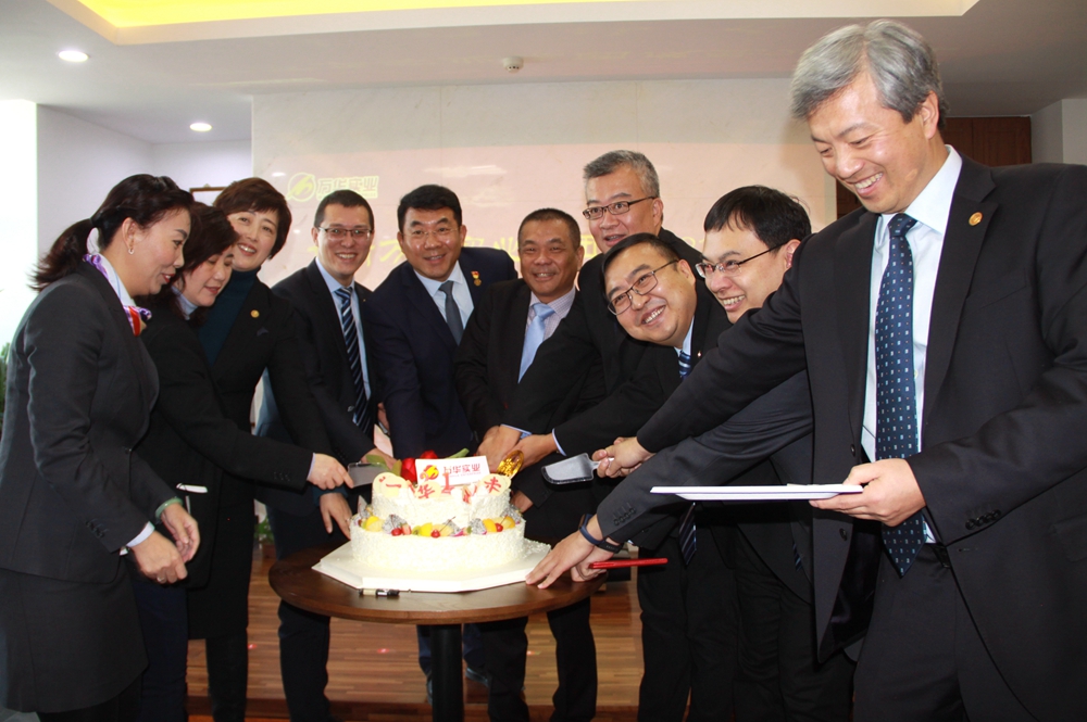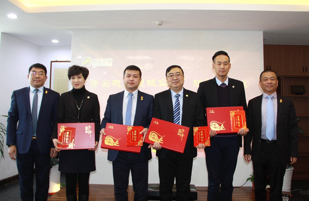 萬華金慧總經理施強,監事會主席陳永華,董事會秘書王鑫,副總經理張育民與新晉司齡5年和10年的老員工授勛合影,分享生日蛋糕共慶萬華21周年