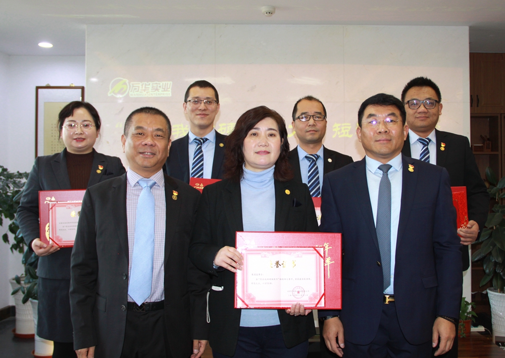 天水勝華總經理白鵬飛為司齡新晉5年和10年老員工佩戴金銀徽章并合影