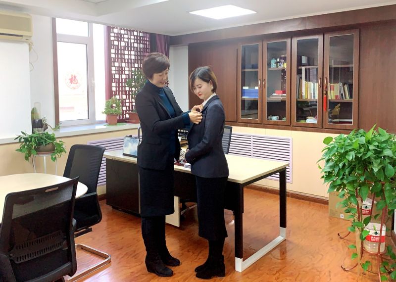 青海金易達總經理丁云艷為司齡新晉5年和10年老員工佩戴金銀徽章,與全體員工共同送出對萬華21歲生日的祝福