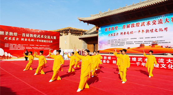 10月10日,朝圣敦煌——首屆敦煌武術(shù)交流大賽開幕式在千年敦煌·月牙泉小鎮(zhèn)民俗文化旅游景區(qū)盛大開幕。武術(shù)大賽在敦煌市委、市政府的大力支持下由甘肅省太極拳協(xié)會(huì)、太極網(wǎng)、未來(lái)傳媒、廣至傳媒、北京甘肅商會(huì)主辦,四方拍賣、敦煌千年古城文化發(fā)展有限公司承辦,千年敦煌·月牙泉小鎮(zhèn)民俗文化旅游景區(qū)、敦煌市武術(shù)協(xié)會(huì)、敦煌市太極拳協(xié)會(huì)、臨夏州太極拳協(xié)會(huì)、蘭州銀行敦煌分行、中國(guó)民營(yíng)文化產(chǎn)業(yè)商會(huì)、中國(guó)收藏家協(xié)會(huì)、甘肅收藏家協(xié)會(huì)、蘭州市名匯秦川商貿(mào)有限公司、北京微海聯(lián)合電子商務(wù)有限公司、甘肅省臨洮縣豐盈綠洲種植專業(yè)合作社協(xié)辦。全國(guó)武術(shù)愛(ài)好者在充滿魅力的人文敦煌首次同臺(tái)競(jìng)技。