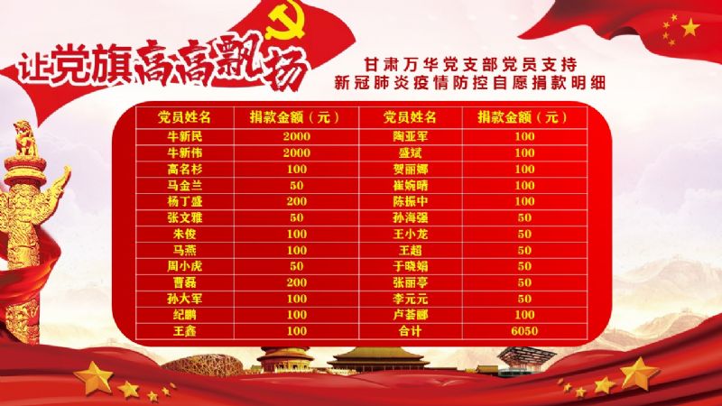 截止到當日17時,共有25名萬華集團黨支部黨員、預備黨員、入黨積極分子自發地進行了捐款,捐款總額6050元。這筆捐款通過蘭州市總商會黨委統一捐至防疫工作最需要的第一線,主要用于慰問戰斗在疫情防控斗爭第一線的醫務人員、基層干部群眾、公安民警和社區工作者等,資助因患新冠肺炎而遇到生活困難的群眾和因患新冠肺炎去世的群眾家屬,慰問在疫情防控斗爭中犧牲的干部群眾家屬等。