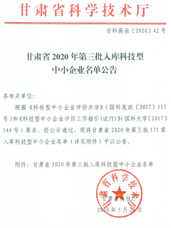 甘肅省2020年第三批入庫科技型中小企業共有175家,甘肅萬華金慧科技股份有限公司經過企業自主評價、評價機構審核等程序,通過認定,成功入選。甘肅萬華實業集團旗下已有兩家科技公司入庫。